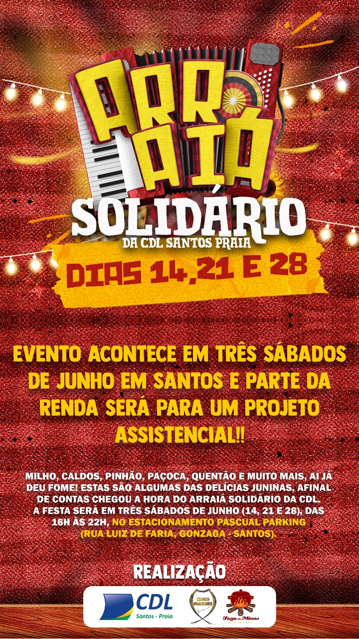 Milho, caldos, pinhão, paçoca, quentão e muito mais, ai já deu fome! Estas são algumas das delícias juninas, afinal de contas chegou a hora do “Arraiá Solidário da CDL”. A festa será em três sábados de junho (14, 21 e 28), das 16h às 22h, no Estacionamento Pascual Parking (Rua Luiz de Faria, 59, Gonzaga – Santos).