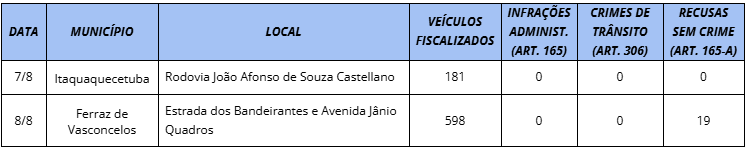 As operações da última semana aconteceram em 28 cidades do estado: Bariri, Bauru, Bebedouro, Bertioga, Bragança Paulista, Carapicuíba, Castilho, Ferraz De Vasconcelos, Franca, Garça, Guarulhos, Ilhabela, Itapetininga, Itaquaquecetuba, Itararé, Itu, Jundiaí, Ourinhos, Pariquera-Açu, Piracicaba, Porto Ferreira, Registro, São José do Rio Pardo, São Paulo (Centro), São Vicente, Sertãozinho, Tanabi e Vargem Grande Do Sul. No total, foram 20.408 veículos fiscalizados, resultando em 333 infrações, sendo 308 recusas ao teste do bafômetro, 22 autuações por direção sob efeito de álcool e outras três por crime de trânsito – aplicadas quando o condutor dirige embriagado.
