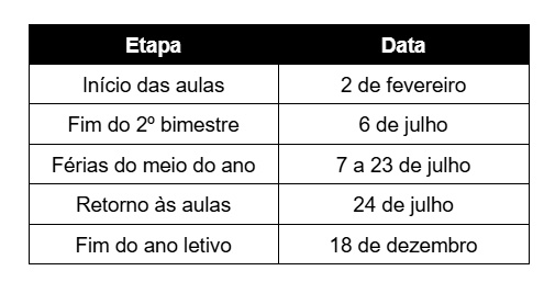 De acordo com a resolução publicada na edição de 26 de setembro do Diário Oficial do Estado, o encerramento do primeiro semestre será em 6 de julho. Já as férias do meio do ano dos estudantes estão agendadas para o período entre 7 e 23 de julho. A partir de 24 de julho, os alunos voltam às aulas para o segundo semestre.