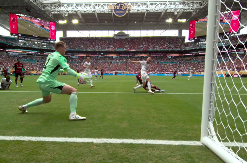 Na volta para o segundo tempo, logo aos seis minutos, após cruzamento de Arrascaeta, Olise colocou a mão na bola, pênalti para o Mengão: Jorginho cobrou, converteu e diminuiu o placar em Miami.