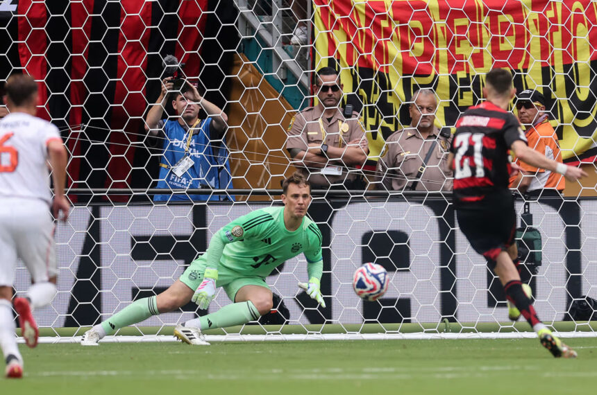 E quando o Flamengo conseguiu subir para o ataque, em cruzamento de Wesley, a bola chegou a De Arrascaeta, que tocou para a segunda trave, Luiz Araújo acertou de prima, mas Neuer fez milagre ao tirar de braço direito.