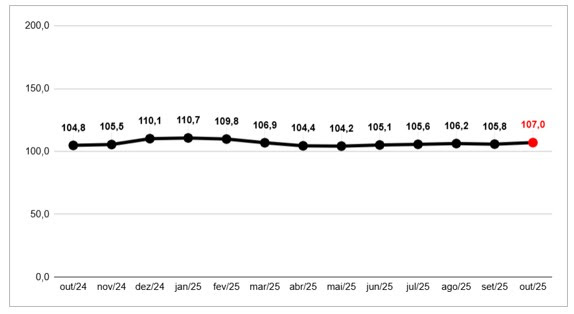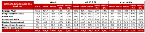 Na análise por faixa de renda, as famílias com até dez salários mínimos registraram alta de 1,1%, alcançando 105,1 pontos, e crescimento de 5,1% na comparação anual, estimulado pela desaceleração da inflação. Já entre os lares com renda superior a dez salários mínimos, o indicador subiu 1,2%, para 112,4 pontos, mas apresentou queda de 5,1% em comparação com o mesmo período do ano anterior — refletindo a maior sensibilidade dessa faixa às condições macroeconômicas, como incertezas fiscais e volatilidade internacional.