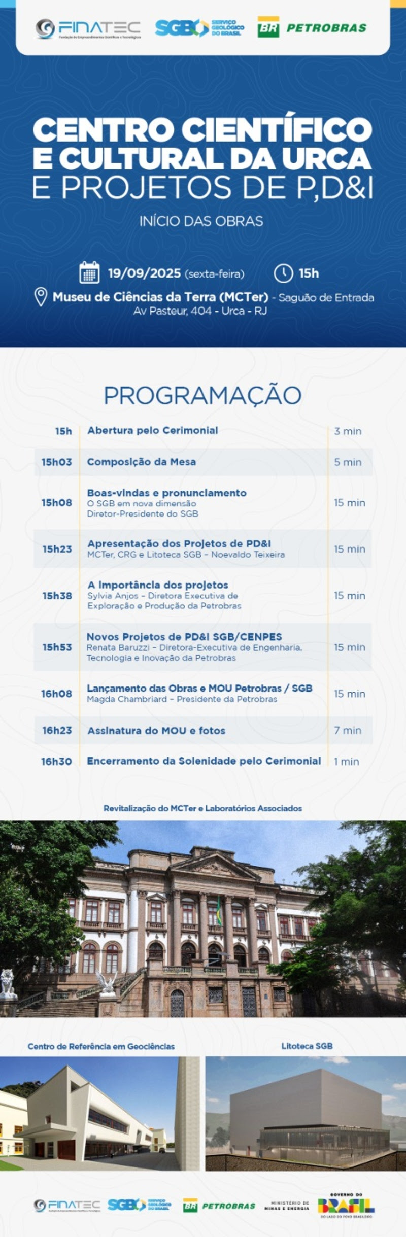 A cerimônia do dia 19 de setembro, às 15h, oficializará – por meio do lançamento dos processos licitatórios pela FINATEC – o início das obras do Centro Científico e Cultural da Urca, no Rio de Janeiro. Na ocasião, serão apresentadas informações técnicas sobre o projeto, com presença das diretorias do SGB, Petrobras, Finatec e ANP.