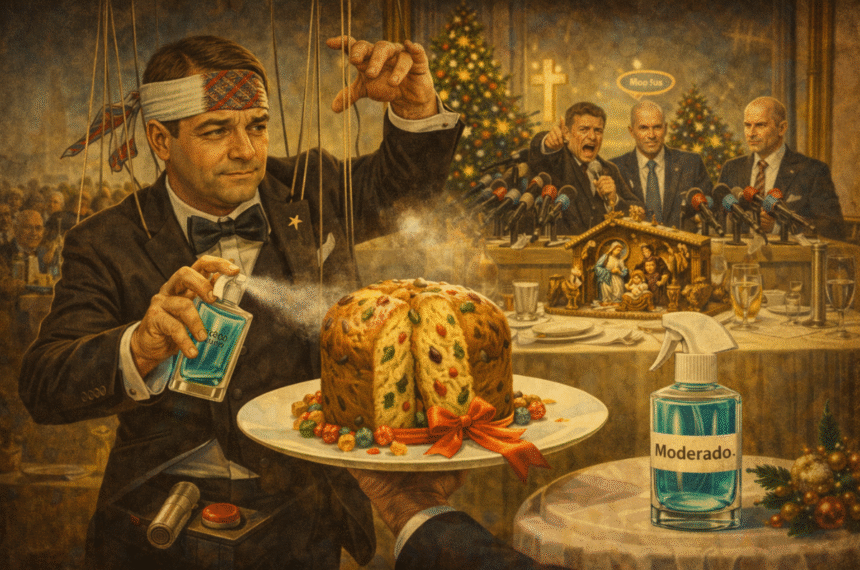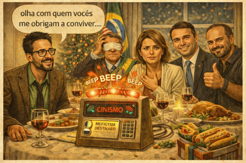 E o brinde, claro, vem com aquela solenidade de comercial de margarina, só que na taça tem cidra fingindo ser champagne, porque a realidade também adora cosplay. Mistura com peru, comida agridoce, sobremesa que parece trégua e conversa que parece armadilha, e pronto: está montado o cenário perfeito para a política fazer o que ela faz melhor, que é entrar na sala sem pedir licença e sentar no lugar do bom senso. Até o presépio ganha pauta, a árvore ganha ideologia, e o bom velhinho vira argumento, porque aqui símbolo não descansa nem no feriado.