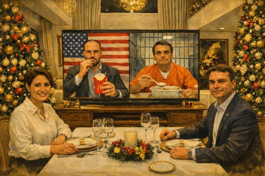 E tem o detalhe que dói mais do que a entrevista cancelada: a briga pelo controle do sobrenome. Flávio queria o carimbo ao vivo, aquele apoio dito em voz alta que transforma pré-candidatura em destino, mas apoio ao vivo é coisa cruel, não volta pra embalagem e ainda deixa recibo. No fim, a ordem do dia não é “fale bonito”, e sim “fale pouco”. O recado que circula na mesa é o mais brasileiro possível: manchete passa, processo fica — e uma frase torta gruda mais do que glitter de Natal. A cadeia, nessa lógica, vira cenário e a saúde vira escudo, porque no bolsonarismo até o termômetro precisa combinar com a estratégia. O Natal privatizado é isso: até a fala do preso vira franquia, com autorização, veto e manual de marca.