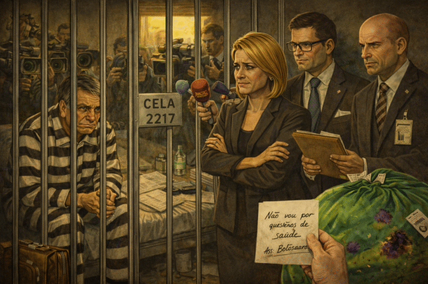 A expressão “por questões de saúde” funciona como guarda-chuva: cobre febre, cobre medo, cobre estratégia, e ainda dá pra fingir que é Deus quem está mexendo no roteiro. E aqui o roteiro é cruelmente prático: se fala demais, vira prova; se não fala, vira mártir. Se concede entrevista, atrapalha a tese do abatimento, se cancela, reforça a ideia de que o corpo é trincheira e a cela é cenário, porque no bolsonarismo até a própria pulsação virou assessoria de imprensa.