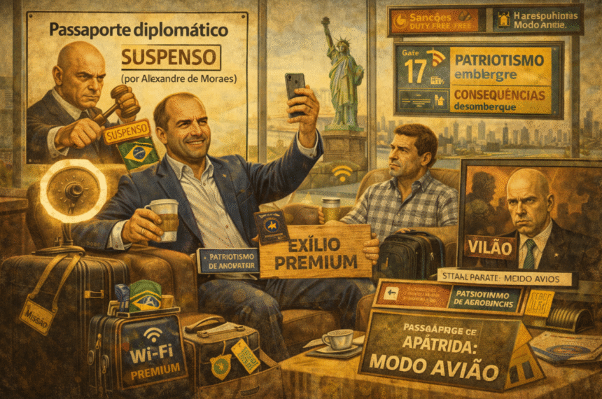 A Câmara cassou o mandato de Eduardo por faltas e, com a perda do mandato, ele perde também os privilégios que vinham no pacote do cargo. Aí entra o “exílio premium”: não é fuga, é “missão”, não é ausência, é “luta”, não é conveniência, é “sacrifício” com Wi-Fi bom e café nos “esteitis”. Segundo ele próprio, existe o risco de ficar sem passaporte brasileiro e até a ideia de pedir “passaporte de apátrida”, como se a pátria fosse um aplicativo que você desinstala quando trava. É a tragédia da era digital: a pessoa transforma documento em performance e chama de filosofia.