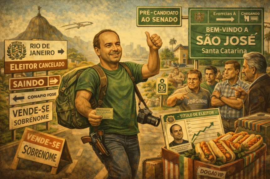 Se o Natal é tempo de mudança, o clã resolveu fazer disso um esporte radical: Carlos Bolsonaro troca o Rio por São José, troca o título de eleitor e tenta trocar o Senado de endereço, como quem muda de mesa na praça de alimentação porque “a luz aqui favorece”. A justificativa vem embrulhada em texto de rede social, com cheiro de crônica pronta: “paz e segurança”, futebol de sábado, clube de tiro, nostalgia e cachorro-quente com molho da casa. É o “vim visitar e acabei ficando”, só que com mandato na mala e palanque no porta-malas. E, no bolsonarismo, até mudança de CEP vira epopeia, porque tudo precisa parecer missão, nunca conveniência.