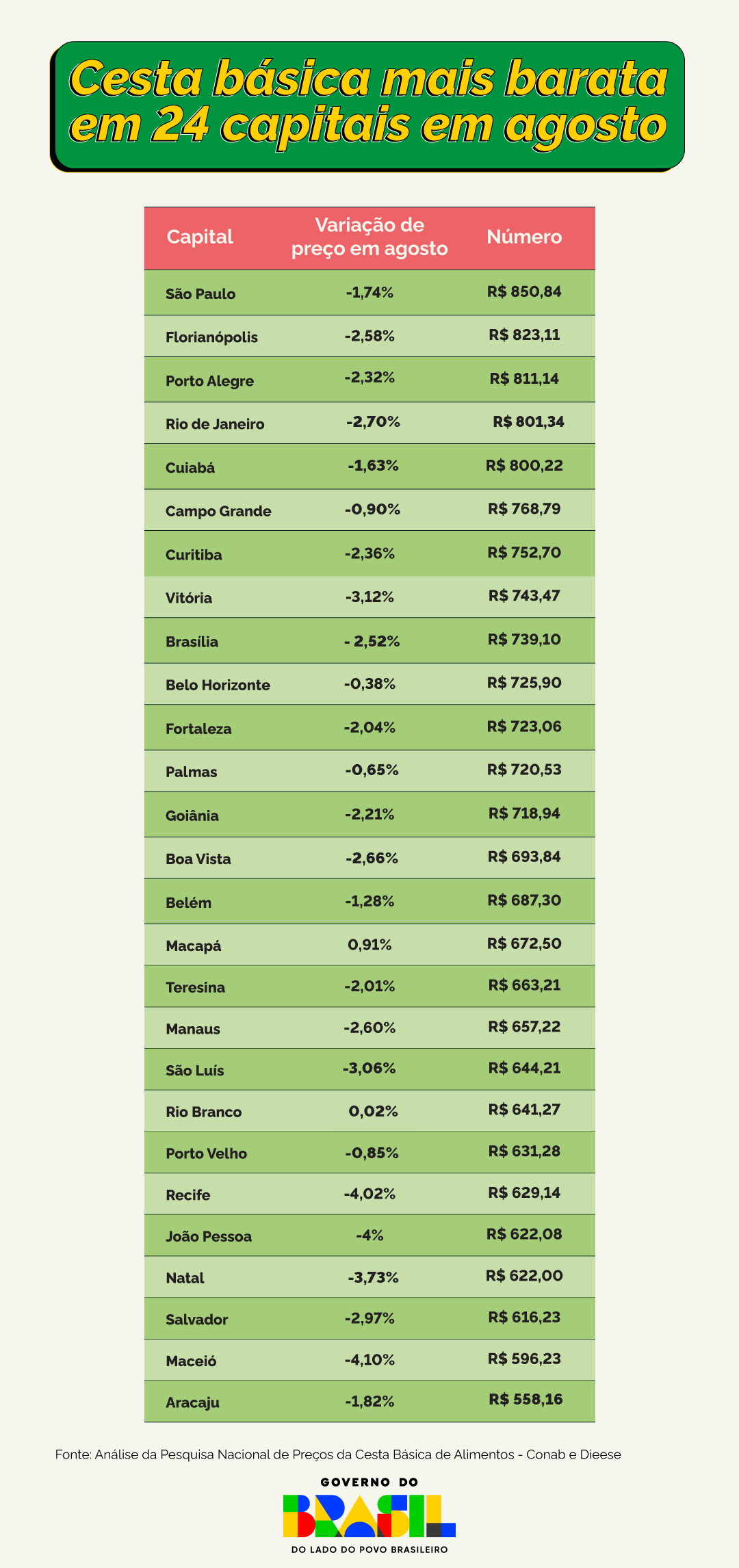 A Análise da Pesquisa Nacional de Preços da Cesta Básica de Alimentos para o período de agosto de 2025, realizada em parceria pela Companhia Nacional de Abastecimento (Conab) e pelo Departamento Intersindical de Estatística e Estudos Socioeconômicos (DIEESE), apontou que o custo da cesta caiu em 24 das 27 capitais no mês passado.