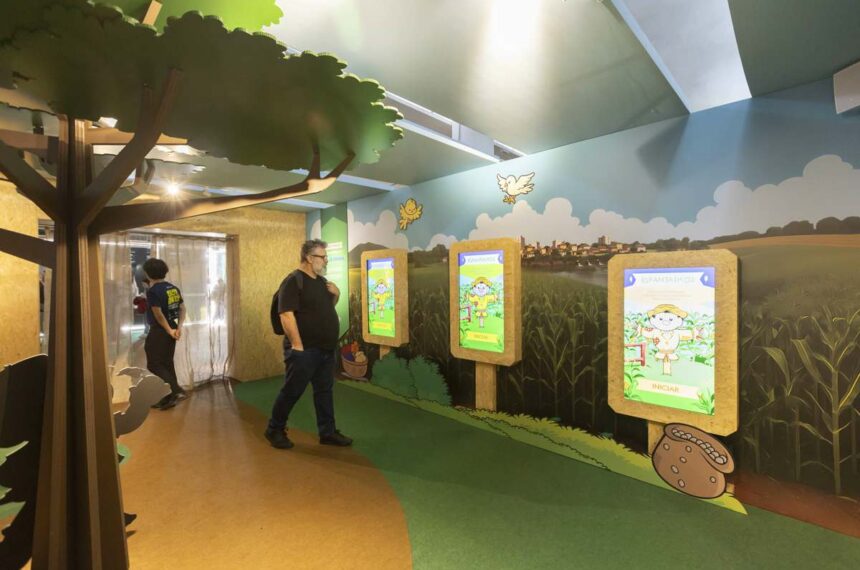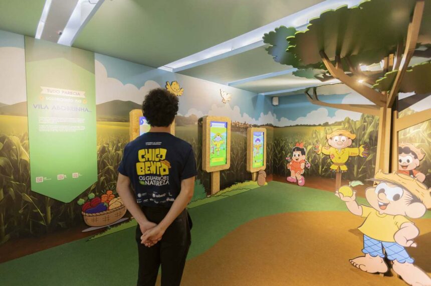 A primeira etapa do percurso se chama Tudo Começa com a Natureza. Nela, o público é recebido em um cenário de fazenda, com galinheiro, pomar, árvores cenográficas e, ao fundo, prédios da cidade, ressaltando o contraste entre o ambiente rural e a urbanização. Ali, os visitantes podem montar um espantalho interativo, enquanto escutam mensagens do próprio Chico Bento sobre a importância de cuidar da natureza. Frases como “Se cada um cuidá dum pedacim, o mundão inteiro agradece” e “Quando a água seca, o povo aprende na dor o qui podia tê aprendido no amor” reforçam o tom afetivo e educativo da experiência.
