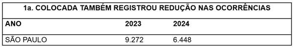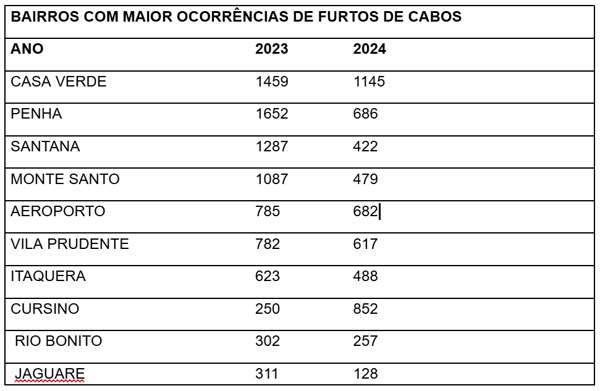 A cidade de São Paulo, sozinha, alcançou uma redução de 30,45% em ocorrências de furtos de cabos de 2023 para 2024. A cidade foi palco de 67% dos casos de furtos de cabos em 2024 (6448 furtos na Capital, 9633 em toda área de concessão da Enel SP).