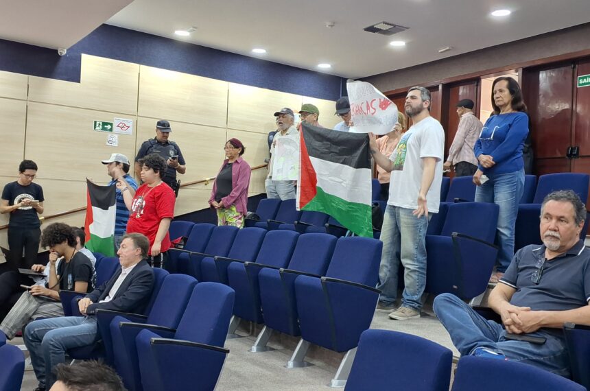 Contudo, entre uma fala e outra dos vereadores, os manifestantes entoavam gritos de protesto em favor do povo palestino, inclusive, o presidente da Casa, Dr. Seraphim, teve que suspender a sessão por cinco minutos até que o plenário mantivesse a ordem.