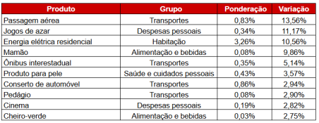 Entre os produtos com maior alta, além dos já mencionados, o jogo de azar foi responsável por um dos maiores aumentos de julho, com 11,2%, em função do reajuste do valor da aposta da Mega-Sena, principal fator para a alta de despesas pessoais (1,02%), junto com cinema (2,82%). Seguido por produtos de grupos variados como mamão (9,86%) e cheiro-verde (2,75%) no grupo de alimentos, produtos para pele em saúde (3,57%) e conserto de automóvel (2,94%) em transporte [tabela 3].