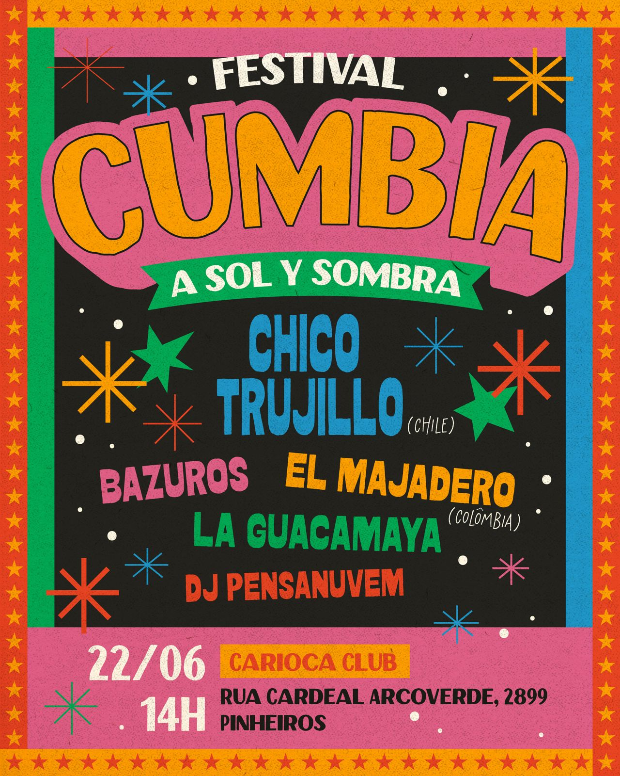 No próximo dia 22 de junho, São Paulo sedia o maior festival de cumbia já realizado na cidade. Batizado de Cumbia a Sol y Sombra, o evento acontece no Carioca Club, em Pinheiros, e traz pela primeira vez à capital paulista a banda chilena Chico Trujillo, uma das maiores referências mundiais do gênero. A eles se juntam nomes que formam o coração da crescente cena paulistana de cumbia: Bazuros, La Guacamaya, El Majadero, Aleksey e a DJ Pensanuvem, residente do coletivo Macumbia, uma das precursoras da cumbia em São Paulo.
