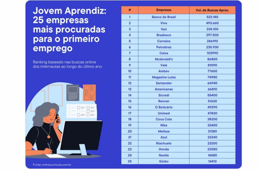 Diante desse cenário, a plataforma especializada em carreiras analisou quais empresas são mais desejadas por esse público para iniciar a trajetória profissional. O levantamento, que englobou pesquisas online feitas entre março de 2024 e 2025, teve como foco expressões como “jovem aprendiz em” e registrou mais de 3 milhões de buscas relacionadas a diferentes empresas. Entre os segmentos mais procurados, destacam-se o setor financeiro, de telefonia, alimentação e bebida.