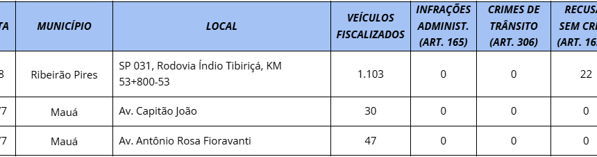 As operações da última semana aconteceram em 28 cidades do estado: Assis, Bauru, Bebedouro, Campinas, Embu-Guaçu, Franca, Itatiba, Itu, Jundiaí, Mairinque, Mauá, Mogi das Cruzes, Panorama, Pariquera-Açu, Peruíbe, Piraju, Praia Grande, Promissão, Registro, Ribeirão Pires, Rubiácea, Salmourão, Santa Fé do Sul, São João da Boa Vista, São José do Rio Pardo, São Paulo (Zona Oeste), Sertãozinho e Suzano. No total, foram 17.078 veículos fiscalizados, resultando em 416 infrações, sendo 388 recusas ao teste do bafômetro, 26 autuações por direção sob efeito de álcool e outras duas por crime de trânsito – aplicadas quando o condutor dirige embriagado.