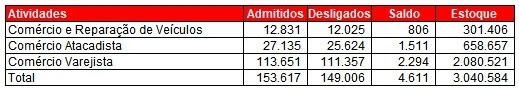 O comércio varejista somou 2.294 novos empregos, enquanto o atacadista gerou 1.511 postos e o segmento de comércio e reparação de veículos obteve saldo de 806. O estoque total do setor atingiu 3,04 milhões de vínculos formais, o maior nível da série recente.