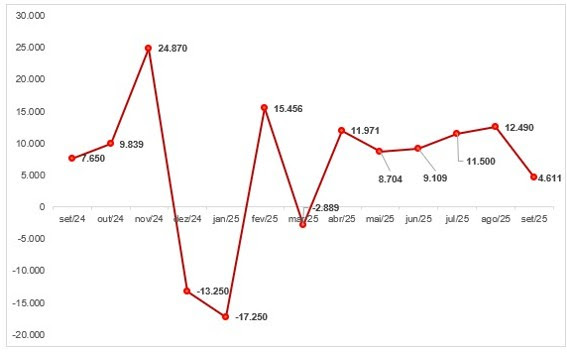 No Comércio, setembro registrou abertura de 4.611 postos de trabalho, com 153.617 admissões e 149.006 desligamentos. Embora o saldo seja positivo, confirma a desaceleração já observada em agosto, quando haviam sido criadas 12,5 mil vagas — uma redução de 39,7%.