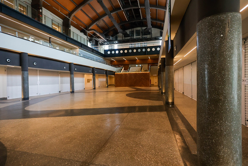 No restante do Mercado Municipal de Santos, o piso em granilite, composto por uma base cimentícia com grânulos de pedras naturais, como mármore, granito ou quartzo está pronto, faltando apenas o lixamento e a aplicação da resina. O material é conhecido por sua durabilidade, resistência e fácil manutenção.