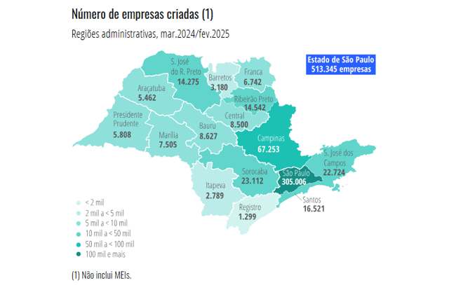 A Região Metropolitana de São Paulo registrou o maior número de MEIs criados entre março de 2024 a fevereiro de 2025, com 409.638 registros, 49,3% do total estadual. Em seguida, apareceram as RAs de Campinas (130.053), Santos (46.652), São José dos Campos (46.572) e Sorocaba (46.422). Outras regiões de destaque foram São José do Rio Preto (26.296), Ribeirão Preto (25.371) e Bauru (18.390).