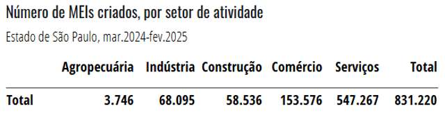 No acumulado dos últimos 12 meses, de março de 2024 a fevereiro de 2025, o Estado de São Paulo registrou a criação de 831.220 MEIs. O setor de serviços concentrou a maior parte dos registros, com 547.267 MEIs, 65,8% do total. Na sequência, apareceram os setores de comércio (153.576), indústria (68.095), construção (58.536) e agropecuária (3.746).