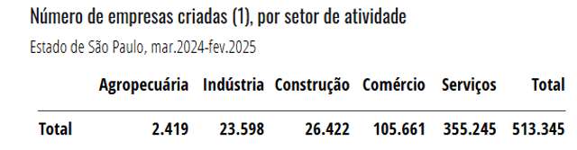 Nessa primeira edição da publicação, os dados mostram que no acumulado dos últimos 12 meses, de março de 2024 a fevereiro de 2025, o estado de São Paulo registrou a abertura de 513.345 novas empresas, excluídos os MEIs. O setor de serviços liderou, com 355.245 novos empreendimentos, 69,2% do total. O comércio ocupou a segunda posição, com 105.661 novas empresas. O desempenho dos demais setores foi: agropecuária (2.419), indústria (23.598) e construção (26.422).