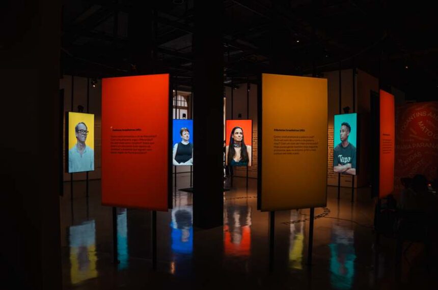 Em cartaz até 14 de setembro, a mostra temporária Fala Falar Falares aborda o ato de falar, um superpoder do ser humano, e destaca a variedade de sotaques brasileiros. Para isso, os curadores Daniela Thomas e Caetano W. Galindo criaram experiências audiovisuais e interativas nas quais o visitante é surpreendido com imagens do que acontece dentro de seu corpo quando canta uma música como Açaí, de Djavan, ou se vê em uma roda de conversa com pessoas de diferentes lugares do país.