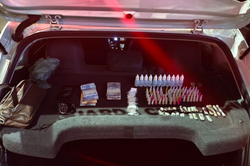 Um adolescente foi alcançado e detido. Com ele, os agentes encontraram uma mochila preta preparada para a venda de ilícitos, contendo R$ 1.398 em espécie e um arsenal de drogas fracionadas: