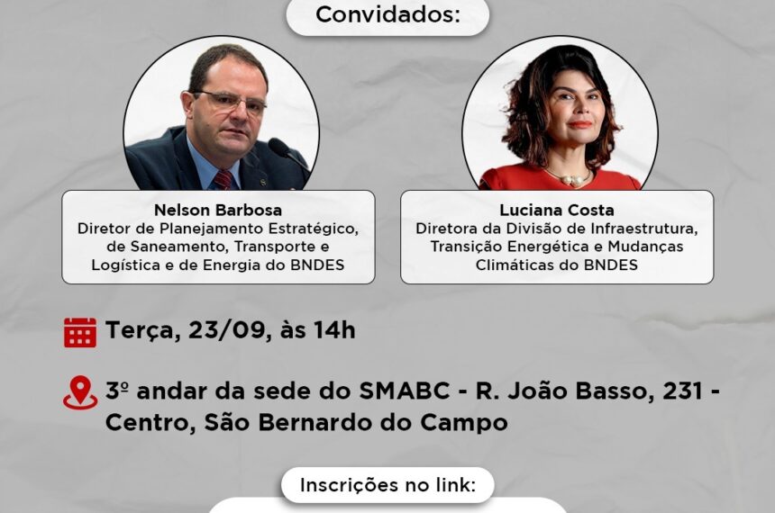 O evento, denominado “Os impactos do Tarifaço no Grande ABC”, será realizado na próxima terça-feira (23/9), na sede do Sindicato dos Metalúrgicos do ABC (SMABC), contará com a presença dos diretores do BNDES de Planejamento e Relações Institucionais, Nelson Barbosa, de Infraestrutura, Transição Energética e Mudança Climática, Luciana Costa.