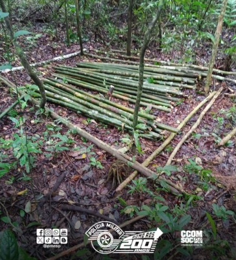 Durante a fiscalização, os policiais descobriram uma canoa amarrada à margem do Rio Ribeira de Iguape. Seguindo rastros deixados por botas na vegetação local, a equipe encontrou uma espingarda artesanal municiada, quatro cartuchos de calibre 36, um pio de madeira, facões e aproximadamente 4,5 kg de milho. Posteriormente, o suspeito foi avistado e confessou que estava montando uma armadilha para a caça de porcos-do-mato. Nenhum animal abatido foi encontrado no local.