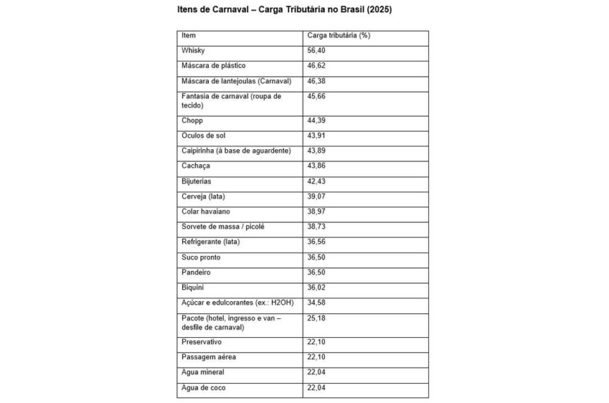 De acordo com levantamento da Associação Comercial de São Paulo (ACSP), baseado na tabela do Impostômetro do Instituto Brasileiro de Planejamento e Tributação (IBPT), o whisky, o chope, a máscara de lantejoulas, a caipirinha e a cachaça são os produtos de Carnaval mais tributados no Brasil.