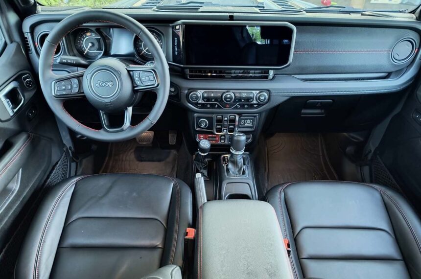 O pacote “Premium Cabin” acrescenta vidros dianteiros acústicos e isolamento extra no para-brisa, capota e colunas “B”, reduzindo ruídos de rodagem e vento. O novo multimídia “touchscreen” de 12,3 polegadas – a maior já oferecida em um Jeep – domina o console central e abriga o sistema Uconnect 5. Há sete entradas USB (A e C) distribuídas pela cabine e tomadas de 12 Volts para garantir energia a todos.