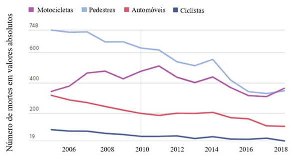 Figura 1 – Evolução anual de mortes na cidade de São Paulo por modalidade de transporte