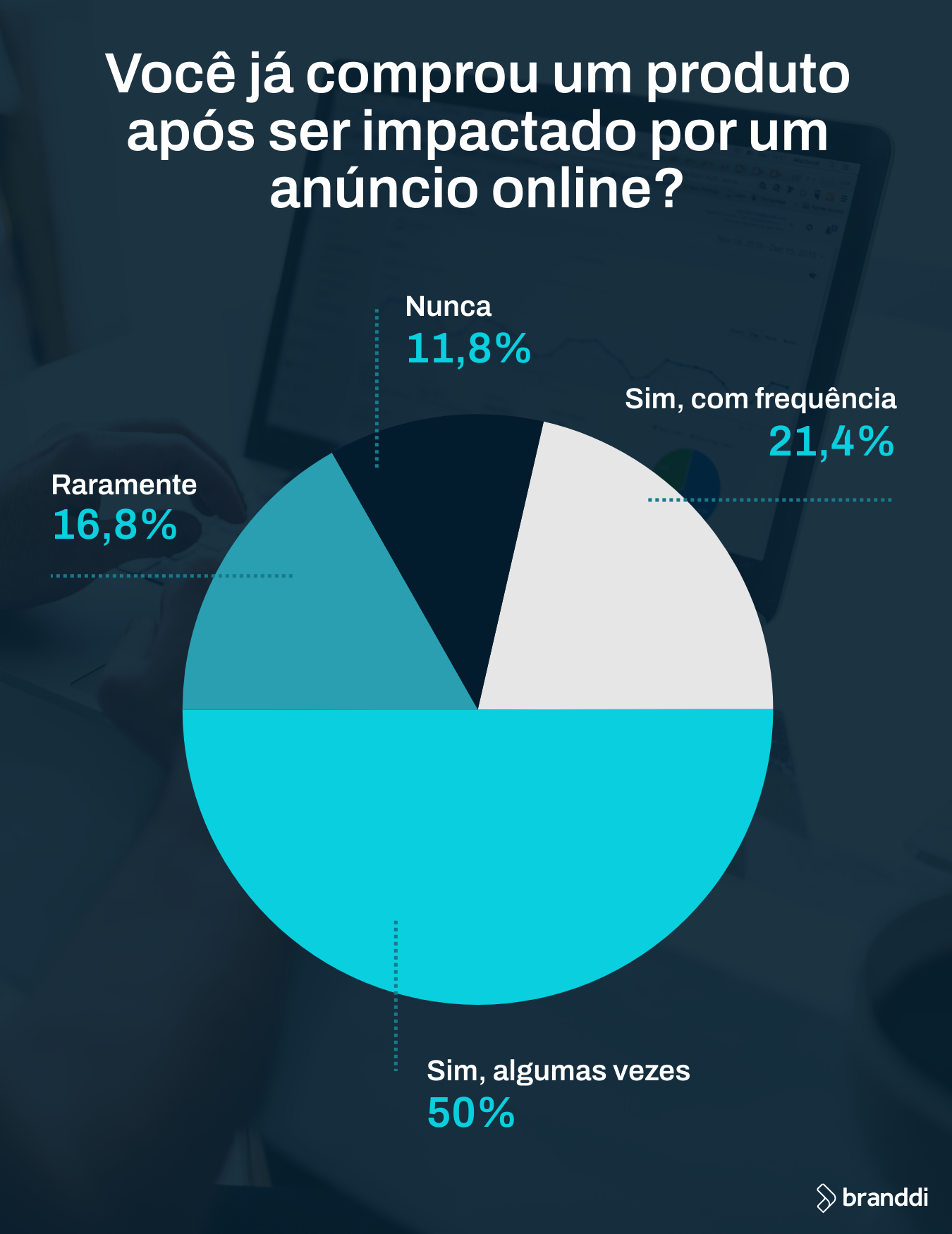 Mas, mesmo que, atualmente, os anúncios sejam alvo de golpes digitais, eles também são uma forma eficaz de conectar marcas aos perfis de consumidores desejados, divulgando seus produtos e serviços. Segundo o estudo, 71% dos entrevistados afirmaram que já compraram após serem impactados por propagandas online, sendo que, desses respondentes, 50% disseram adquirir produtos ou serviços algumas vezes, e 21% com frequência.