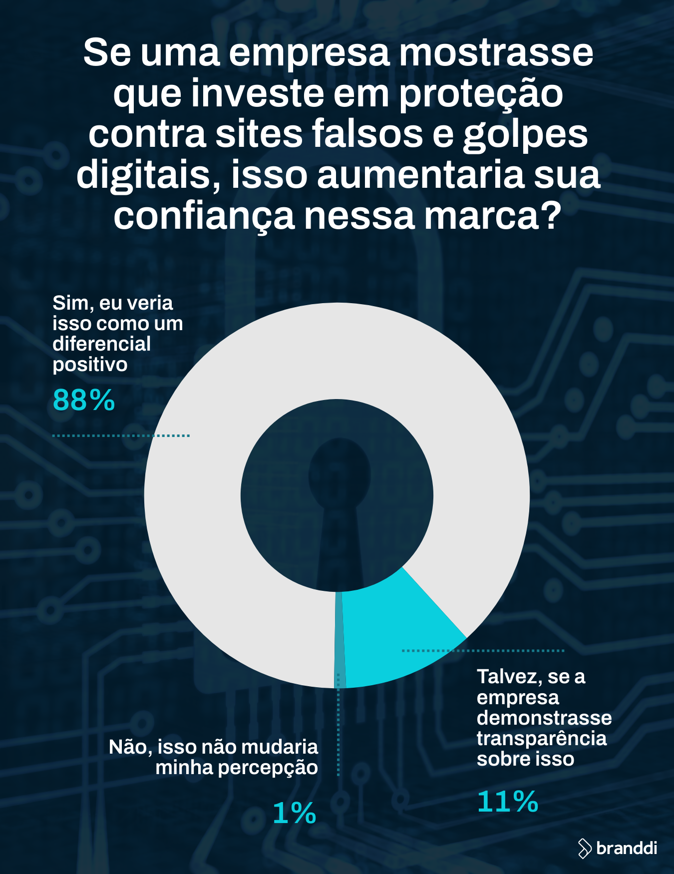 Neste cenário, realizar ações contra os golpes digitais é um ponto que distingue a marca entre as demais pelos consumidores, aumentando a confiança nas que adotam as medidas de proteção. Para 88% dos respondentes, o investimento em proteção contra sites falsos e golpes digitais seria um diferencial positivo para a compra e fidelização com uma marca. Outros 11% consideram as iniciativas importantes, mas entendem que as empresas também precisam demonstrar transparência sobre o tema.