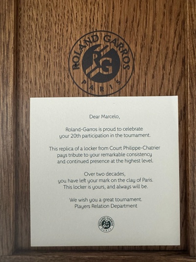 Campeão em 2015, o mineiro ganhou uma réplica da porta do locker que fica no vestiário principal dos jogadores na quadra Philippe Chatrier