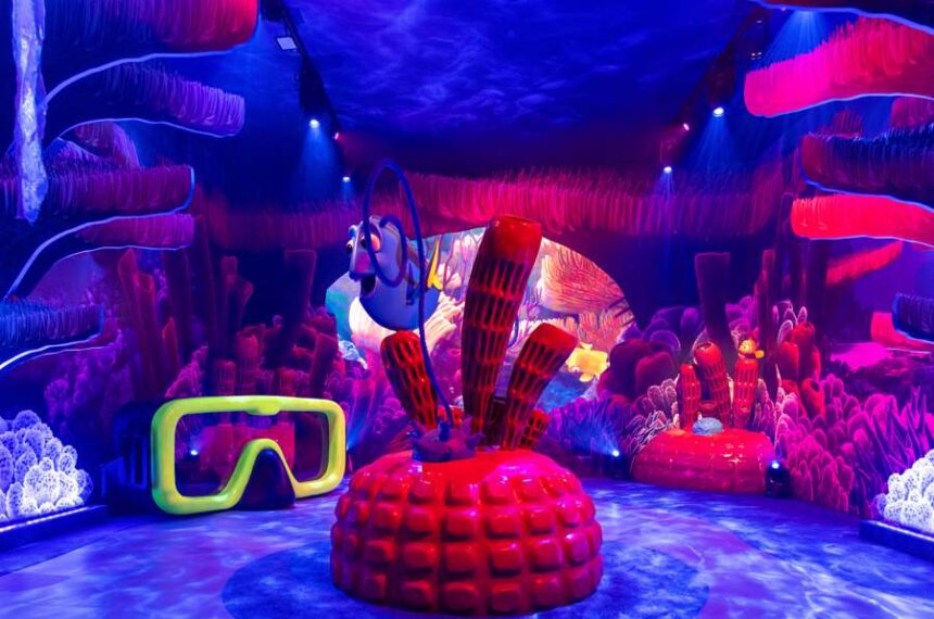 Logo adiante, o fundo do mar ganha vida numa das salas de maior sucesso da exposição: a sala de Procurando Nemo, onde corais coloridos e personagens inesquecíveis compõem o cenário icônico do filme.