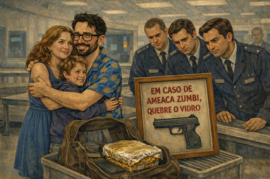 Admirado, olhei meu filho indo de um lado pro outro, perna cruzada e inquietação de quem ainda não aprendeu o valor do tédio. Eu, sentado naquelas cadeiras de plástico metalizado de aeroporto, que mereciam uma versão moderna e um pedido de desculpas, me aconcheguei abraçado ao meu Golden Globe. Vi a mim mesmo ali, meio pai, meio passageiro, e vi meu filho-ratinho ainda com energia, enquanto minha esposa-maluca tentava domar o pequeno roedor com a diplomacia impossível de quem já negociou com sono, fome e fila. Pensei que, no fundo, tudo aquilo fazia sentido demais: um progressista carregando uma pistola de mentira, barrado como ameaça; uma família trazendo uma ameaça real armada, circulando livre; e um voo pro sul atrasado porque o céu resolveu imitar o humor de Brasília.
