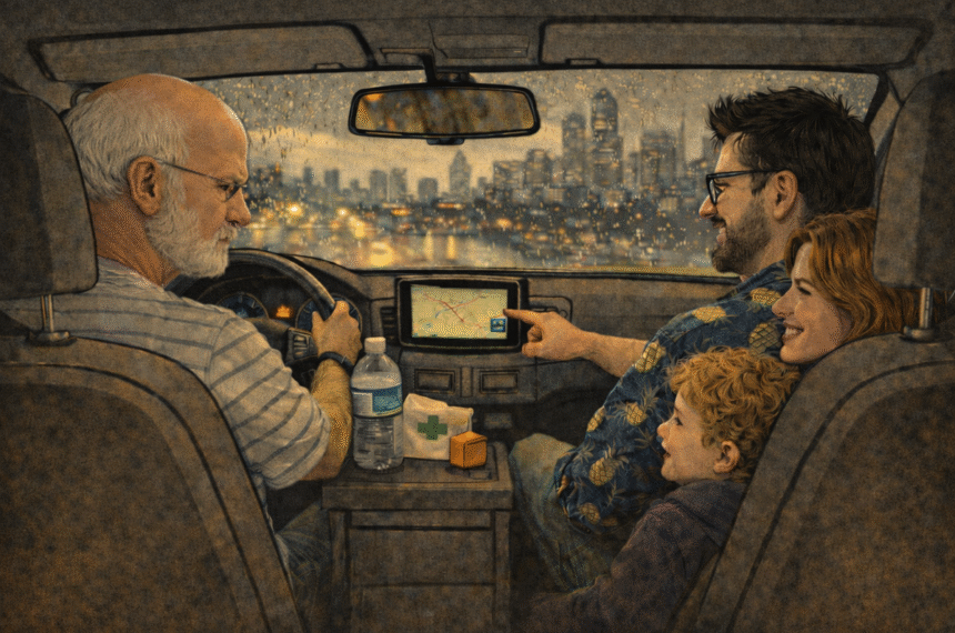 Saímos da locadora em direção ao terminal, naquele translado padrão: van cheia, mala empilhada, criança falando alto, adulto fingindo que não tem medo de avião. E ali começou discretamente a minha via-crúcis particular.