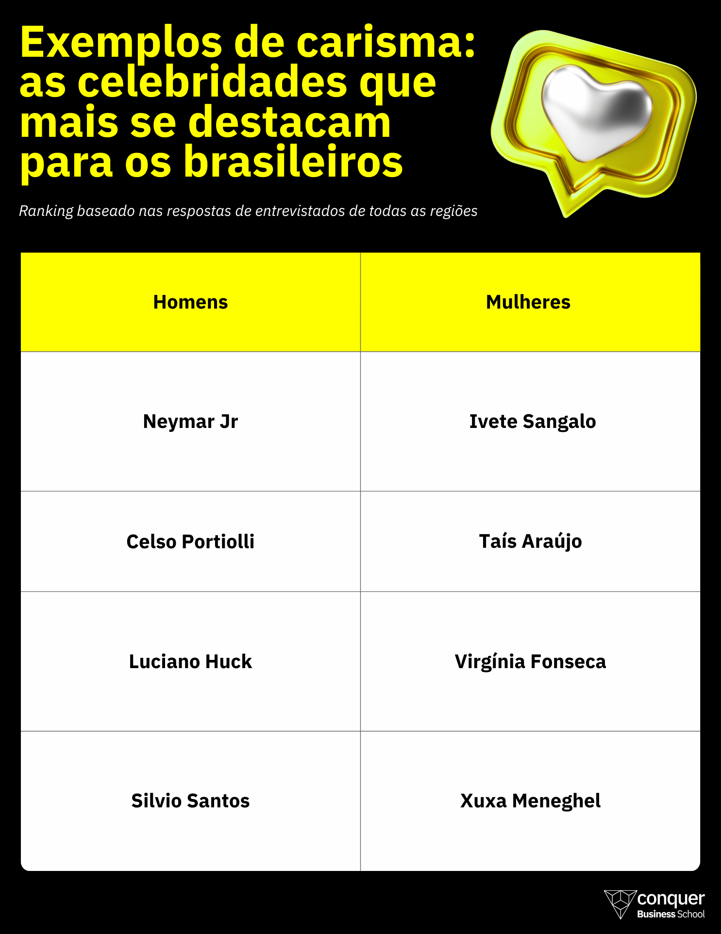 Mesmo sendo comumente associado à simpatia ou extroversão — atributos que uniriam celebridades como Neymar, Celso Portiolli, Taís Araújo e Ivete Sangalo, eleitas as mais carismáticas para os entrevistados —, o estudo da Conquer descobriu que, entre os brasileiros, falar de carisma no trabalho é ir muito além disso.
