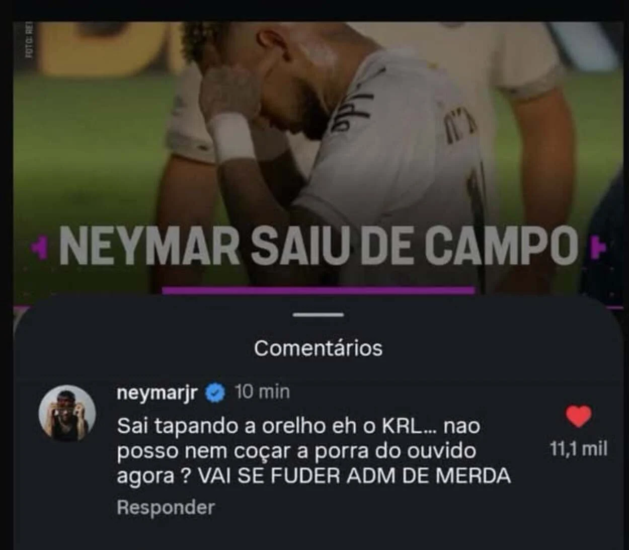 A publicação veio horas depois de um acesso de raiva do jogador no perfil da TNT Sports. Na ocasião, ao ver uma postagem sugerindo que ele estaria “tapando os ouvidos” para as críticas, Neymar disparou: “Sai tapando a orelha é o car**… Não posso nem coçar a **** do ouvido agora? Vai se ***** administrador de *****”.