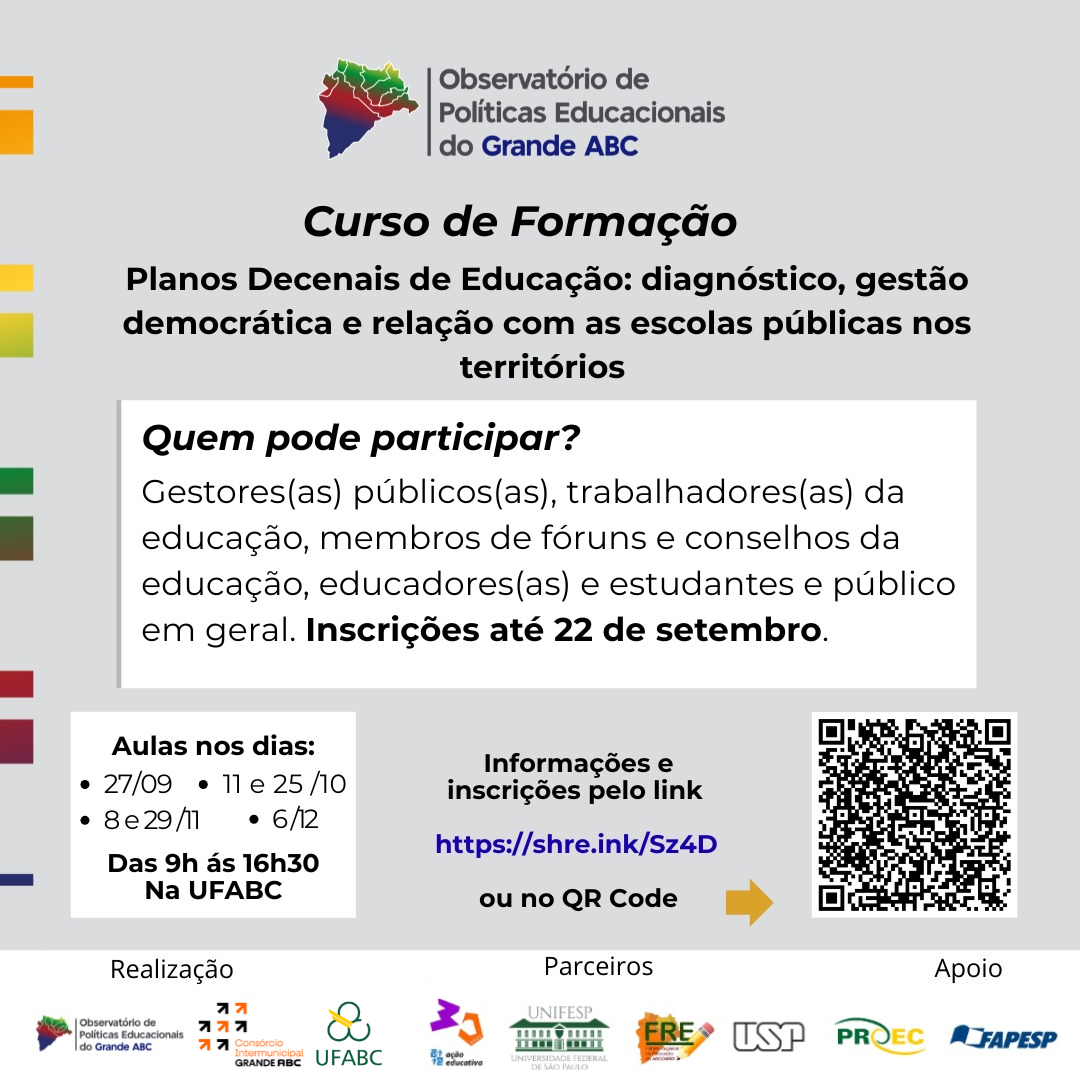 O Observatório de Políticas Educacionais do Grande ABC abriu inscrições para um curso de formação sobre Planos Decenais de Educação. A iniciativa é coordenada pelo Consórcio Intermunicipal Grande ABC e pela Universidade Federal do ABC (UFABC), com financiamento da Fundação de Amparo à Pesquisa do Estado de São Paulo (Fapesp).