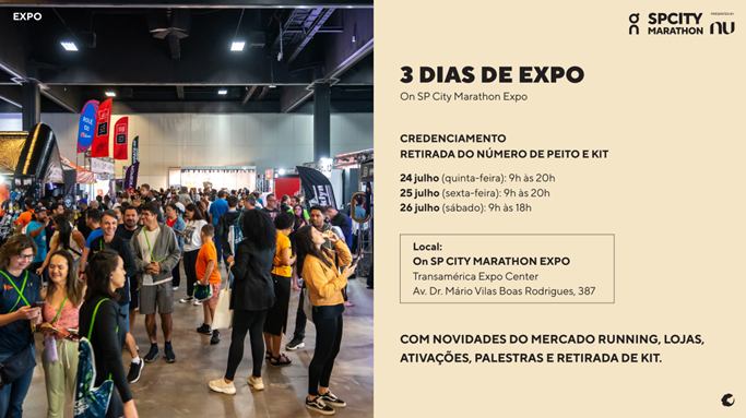 A cidade de São Paulo recebe a On SP CITY MARATHON EXPO, a maior e mais completa feira de corrida de rua do Brasil. O evento acontece de 24 a 26 de julho no Transamérica Expo Center e faz parte da programação oficial da On SP City Marathon, corrida promovida pela Iguana Sports,que acontece na 4ª maior metrópole do mundo e é reconhecida como a maior maratona de São Paulo.
