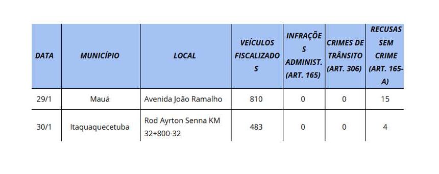 As ações resultaram em 321 infrações relacionadas à alcoolemia, sendo 309 recusas ao teste do bafômetro, 16 autuações por direção sob efeito de álcool e duas ocorrências classificadas como crime de trânsito, quando o motorista foi flagrado dirigindo embriagado.