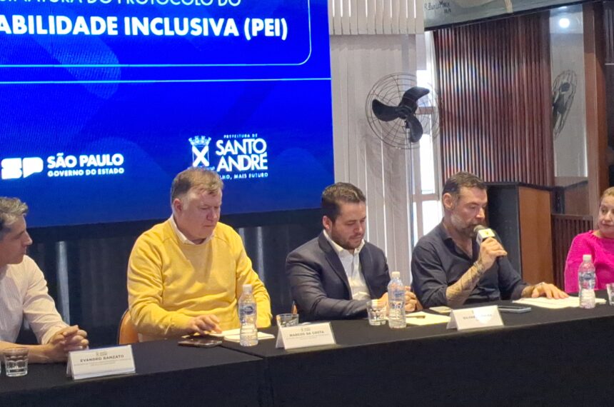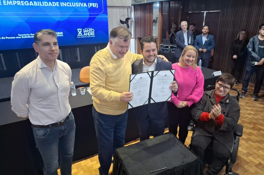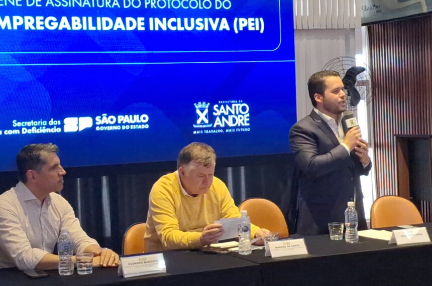 Em um dia de agenda movimentada, nesta terça-feira (10), o Secretário do Estado dos Direitos da Pessoa com Deficiência de São Paulo, Marcos da Costa, após formalizar a criação do PEI (Polo de Empregabilidade Inclusiva) em São Caetano, pela manhã, ao lado do prefeito Tite Campanella, seguiu para a cidade vizinha, Santo André, para cumprir o mesmo rito, mas desta vez com o chefe do Executivo Andreense, Gilvan Ferreira, no Salão Burle Marx, no 9º andar do Paço Municipal.