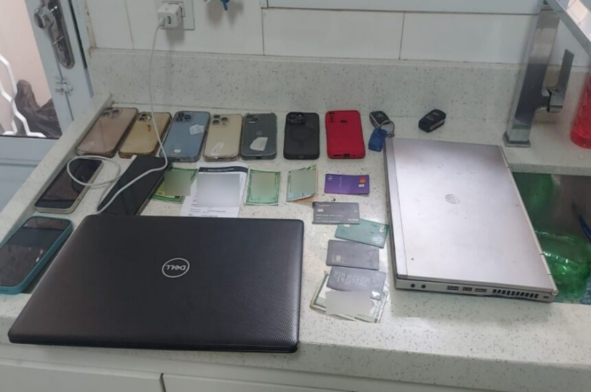 No imóvel, foram apreendidos dez celulares, sete notebooks, sete headphones e sete carregadores, além da quantia de R$ 7,7 mil em espécie. Ainda não há informações sobre as vítimas lesadas pelo bando.