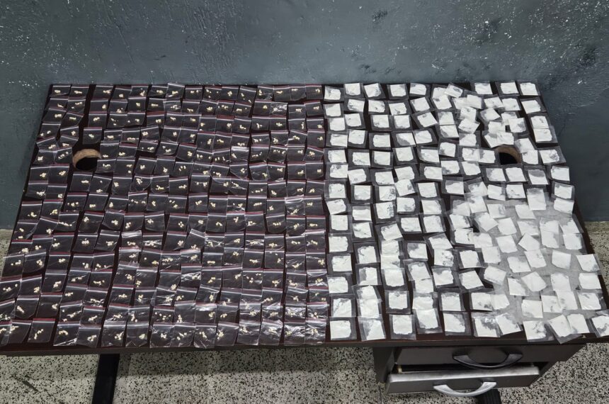 Além da arma de fogo, foi apreendida uma certa quantidade de drogas.