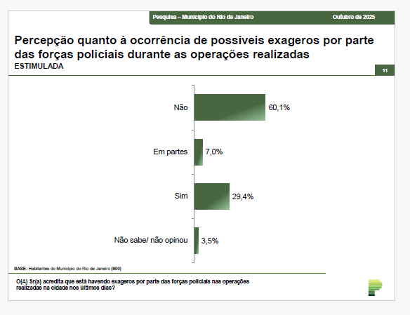 De acordo com a pesquisa do Instituto Paraná, 69,6% são favoráveis à operação policial nos Complexos do Alemão e Penha, no Rio de Janeiro. A pesquisa, realizada, na capital fluminense, tem o objetivo além de consultar a população sobre a avaliação da operação, também entender o que a população avalia os governos estadual e federal no combate à violência e o crime organizado.