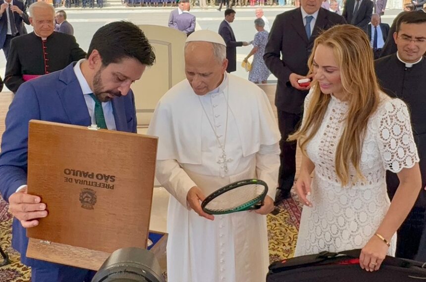 Acompanhado pela primeira-dama, Ricardo Nunes presenteou o pontífice com prato com imagens da capital e raquete da tenista Bia Haddad
