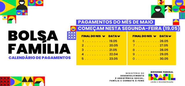 O Bolsa Família chega a mais de 20,46 milhões de famílias em maio, em todos os 5.570 municípios brasileiros, por meio de um investimento de cerca de R$ 13,64 bilhões por parte do Governo Federal. O valor médio do benefício é de R$ 667,49. O cronograma de pagamentos tem início nesta segunda-feira, 19 de maio, e segue até o dia 30, de acordo com o final do Número de Identificação Social (NIS) de cada beneficiário (confira abaixo).